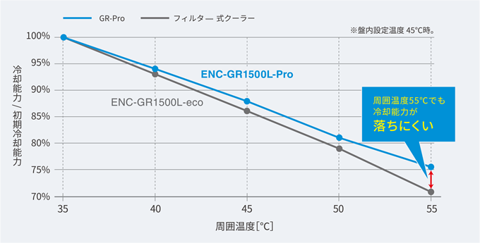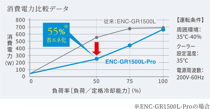 The GR-Pro Series features a decompressor relocated from the capillary tube to the electronic expansion valve. Data from the cooling circuit’s condenser temperature sensor and evaporation temperature sensor are converted to pressure and then used to precisely control electronic expansion valve pressure. The best compressor performance and maintains the best cooling performance even under each high-temperature conditions.